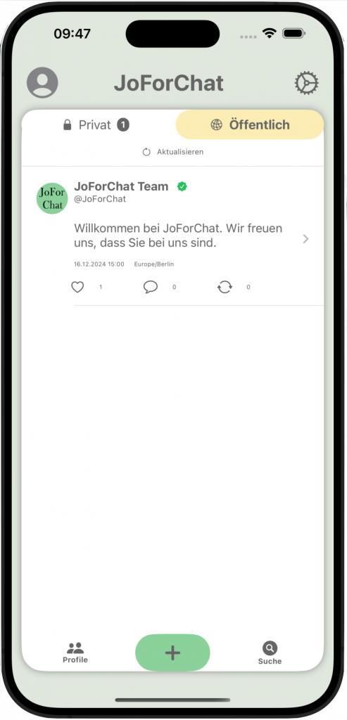 Wir wollen den Ideen, Verbesserungsvorschlägen und Bedürfnissen nachkommen. Dazu können unsere Mitglieder der JoForChat Community sich aktiv einbringen. Dazu einfach das öffentliche Profil von JoForChat Team aufrufen und beim Posts beteiligen.